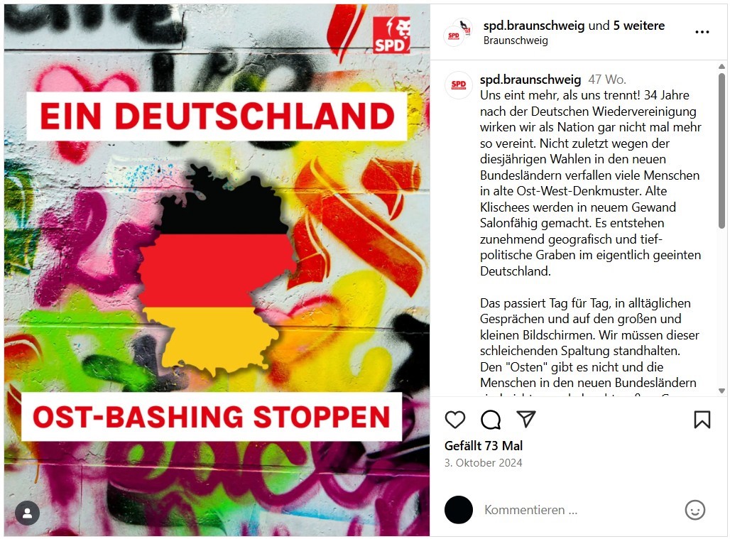 Der Beitrag der SPD Braunschweig vermittelt ein Bild der Einheit als noch unvollendetes Projekt. Zwar sei sie formal erreicht, doch fortbestehende Spannungen, Stereotype und „Ost-Bashing“ gefährdeten den gesellschaftlichen Zusammenhalt. Die Bildgestaltung mit Deutschlandkarte, Graffiti-Optik und Schlagworten verstärkt den appellativen Charakter, während der Text die Deutung argumentativ untermauert. Insgesamt vermittelt der Beitrag eine kritischere Deutung der Einheit und benennt reale Probleme, auch wenn die Darstellung Ursachen wenig differenziert ausführt.