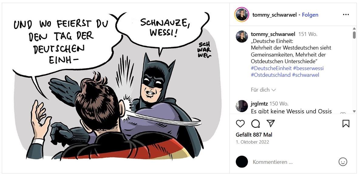 Der Cartoon von Schwarwel nutzt eine bekannte Meme-Vorlage, um Ost-West-Spannungen satirisch zuzuspitzen. Mit der Aussage „Schnauze, Wessi!“ wird humorvoll ein reales Konfliktverhältnis karikiert. Die Gestaltungsmittel sorgen für schnelle Wiedererkennbarkeit und Reichweite, die Deutung der Einheit bleibt konflikthaft und polarisierend. Insgesamt macht der Beitrag Brüche und Kontroversen deutlich, er regt zur Reflexion an, kann aber zugleich Klischees verstärken.